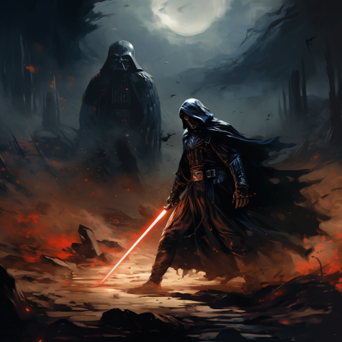 darth Vader fighting obi wan kenobi in an open dirt field with large rocks surrounding area, anime art style, anime, animation, dark lighting, dark theme, lightsabers --upbeta --v 5.2 --s 250