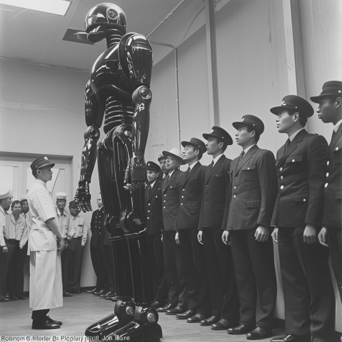 the year is 1943, the first human-like android robot has been made, scientists gather around the tall menacing robot in awe --s 300 --v 6.0 --style raw