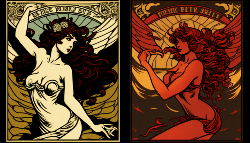 angel battling demon, Art Nouveau style --v 4 --chaos 50 --stylize 50 --ar 16:9