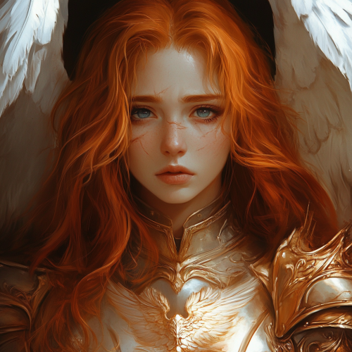 Heartbroken and depressed but determined Archangel general. She is 30 years old. She has massive white wings, long red hair, and deep blue eyes with a soft glow. She looks like Eva Green. She has massive battle-scars across her face. She is wearing elaborate golden Renaissance valkyrie armor. Epic. Dark Fantasy. Baroque style.