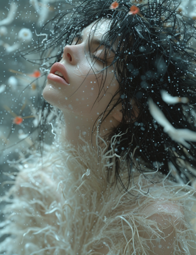 imagine the angry female model wearing black minimalist single color full bodysuit paint made from black feathers, lokks like an angel of the death, surrounded by the white birds, overwhelmed by a massive impossible task, white small spaceships falling from a dark sky, stars flying, massive explosion of a solar system made from flowers in a cubic geometric world made from blossoms in red, and yellow colors --ar 71:92 --style raw --stylize 1000 --v 6.0