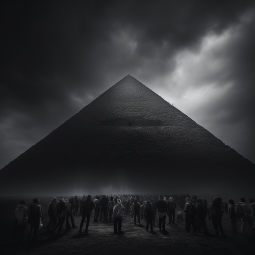 massive black pyramid in a dark atmosphere and masses of poor biblical people are trying to climb it. photo in black and white, front view and symetrical