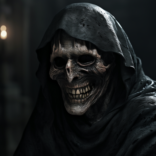 a scene depicting the theme with death comes an eternal smile, a thin human-like smiling personification of death in black robes, depth of field, photorealistic, hyper-realistic, 32k resolution, high definition, intricate detail, natural lighting, natural shading, style 1000, 16:9, chiaroscuro, 85mm lens, tenebrism, v 6.0