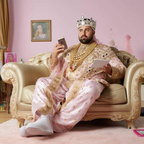 An adult man sitting on ikea furniture brand sofa, hand with Remote, full figure body , detailed face expression , in his hand like watching tv in his ancient Mughal attire sitting on the right corner of the sofa , light pastel background, light pastel home backgroundand modern pastel sofa, sitting like royalty with lot of jewels and necklaces and crown heavy Indian wedding attire, wide angle home