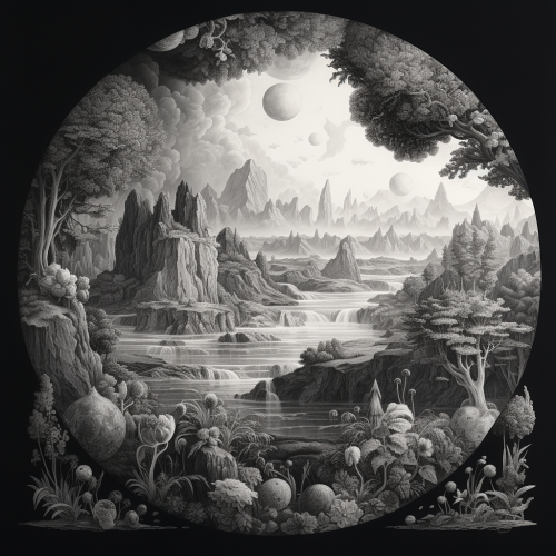 black and white drawing of the earth in the style of Jan Brueghel the Elder