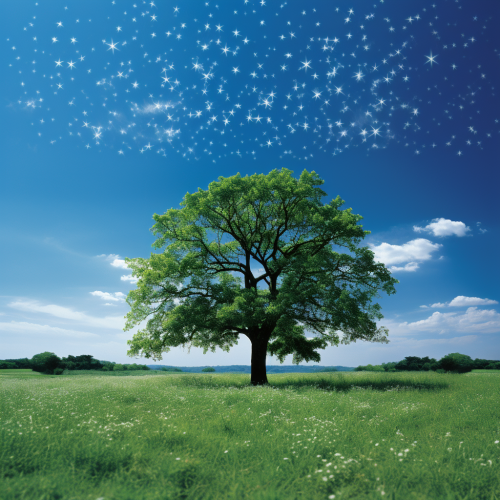 Generate a photograph featuring a hyper-realistic tree at its center, with leaves shaped like stars. The tree's branches should appear as though they are stretching toward the clear, blue sky at the horizon. This photograph should be taken during the day, and the background sky should be blue without any stars. The meadow upon which the tree stands should be lush and green. Divide the photograph into two contrasting halves. On the left side, let the scene radiate brightness and happiness; the colors should be vivid, and everything should evoke feelings of joy. On the right side, change the mood to dark and somber, casting shadows and evoking feelings of melancholy or sorrow, while still maintaining the daytime setting. Your task is to capture this duality in a single, compelling image that prompts viewers to reflect on both the joys and sorrows experienced in the journey of life.