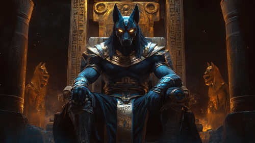 A badass mobster anubis wielding a legendary sickle, sitting on a guilded throne, Highly detailed face, golden glowing eyes, deathly throne, tattered Egyptian armor, deathly appearence, fantasy, pixar, video game --ar 16:9
