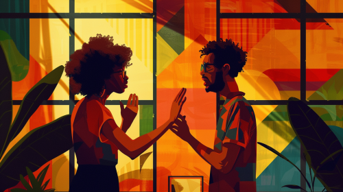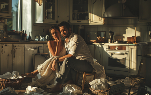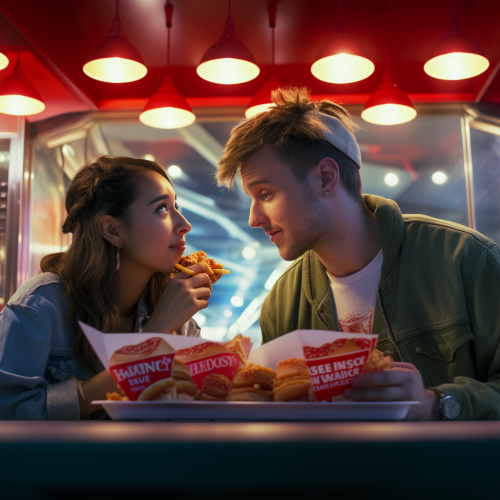 annoyed Couple in front of each other in a fastfood KFC, irritated, looking at each other, arguying, they are eating french fries, neon lightning, 8k, highly detailed, clear facial features, cinematic, 35 mm lens, f/1.8, accent lightning, global illumination