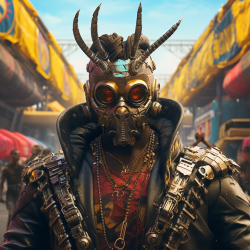 Mix Studio Ghibli style animation and CyberPunk 2077 style art direction mixed with Mad Max Fury Road man wearing a horned mask, I of a future african cyberpunk man,