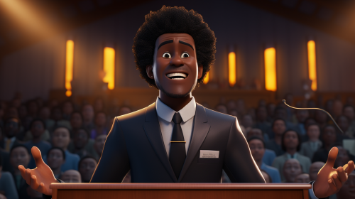 Cinematic still , zealous, , short Afro hair, bold,pastor wearing a black suit standing on the pulpit staring at African American congregation --ar 16:9 --v 5.2