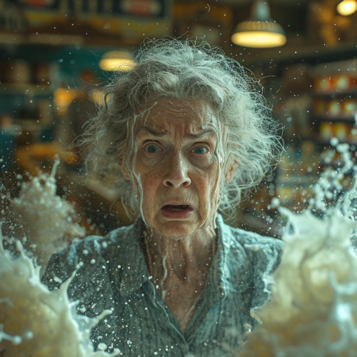 an angry and screaming 50 year old woman throwing a tantrum in a crowed grocery store gets milk dumped on her, photorealistic, hyperrealistic, depth of field, photography, Canon EOS 5D Mark IV DSLR camera, Cinematic, iso 6400, photography, --q 0.5 --v 6.0 --s 750