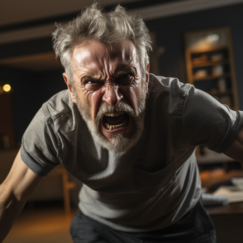 a realistic photo of a man watching the news on TV in his living room, upset, evening --v 6.0 --ar 12:9