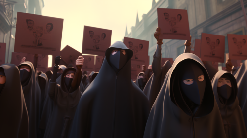 Angry hooded mob protesting with blank signs, Disney Animation, A still frame from the movie 8K Prores --aspect 16:9