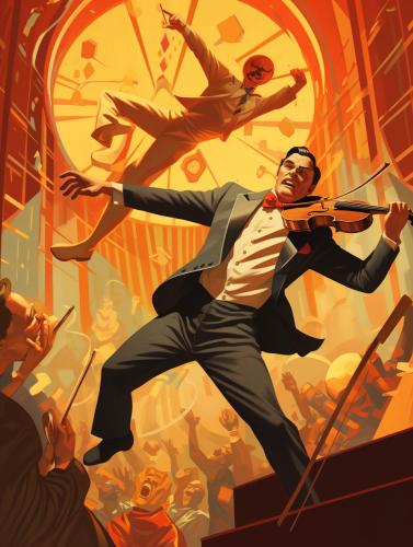 an angry symphony musician jumps from top rope of wrestling ring in a fight with a luchador wrestler, holding a violin. art deco. --ar 3:4