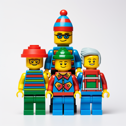 A family of four in Christmas style, rendered in vibrant colors and the style of colorful Lego bricks, inspired by Keith Haring's iconic cartoon style vector art. On white background. The characters have minimalistic designs with fanciful costume elements. The scene is reminiscent of adorable toy sculptures. The overall composition is square, with an aspect ratio of 1:1, and the artistic training is applied moderately with a stylization value of 150. Lastly, to add a touch of uniqueness, the prompt is influenced by the works of Ronald Balfour.