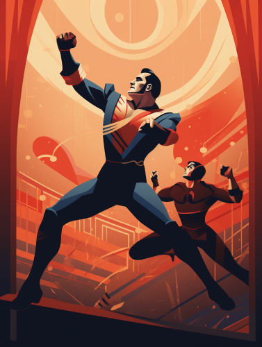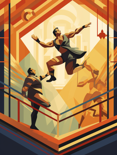 an angry symphony musician jumps from top rope of wrestling ring in a fight with a woman in a luchador mask, holding a violin. art deco. --ar 3:4