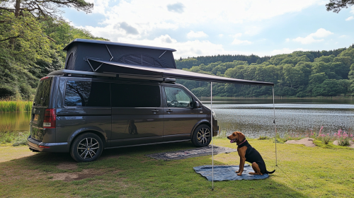 blackberry metallic 2014 T5 transporter camper van with pop top and side awning with a brown cockapoo and a doberman outside of it sat by a lake --style raw --ar 16:9