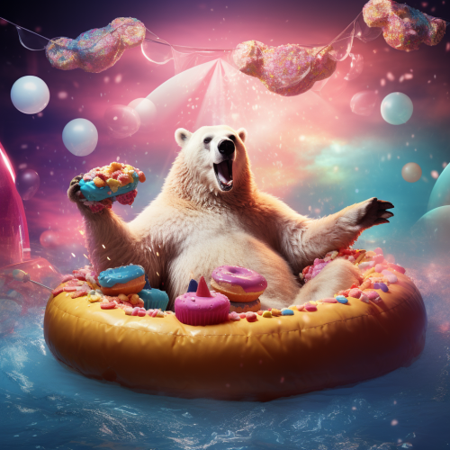 a bear eating pringles while sitting on a unicorn pool floaty in an above ground pool