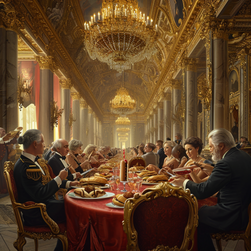 realistic highly fancy hotdog dinner, with heads of state dressed in formal attire eating hotdogs, in a large golden european palace --v 6.0