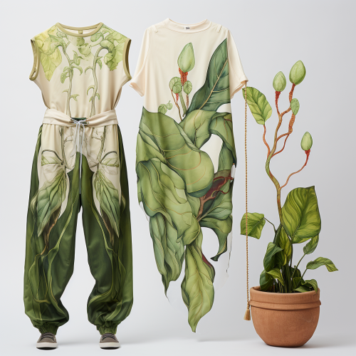 A set of biological plant based clothes that have an amalgamated style of Tibetan and Tolkien Elvish set in a similar style to 'One Punch Man' by Japanese mangaka Yusuke Murata
