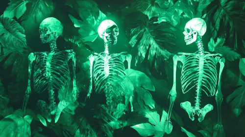 Inspired by the Amazonian rainforest and Festa de São João, show minimal silhouettes of skeletal figures blended with jungle leaves, lit in ghostly green hues, embodying spirits within nature --ar 16:9 --v 6.1
