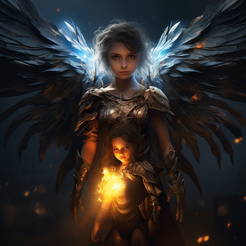 fantasy. A little girl. Like an angel. With warm glowing lights all around her. With her guardian master by her side. He is Her huge protector with Battle scars.