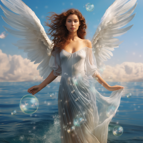 the guardian angel of elements of water with angel wings with brown hair and light blue dress , in the sky , on the sea, bubble and ocean , 8k resolution