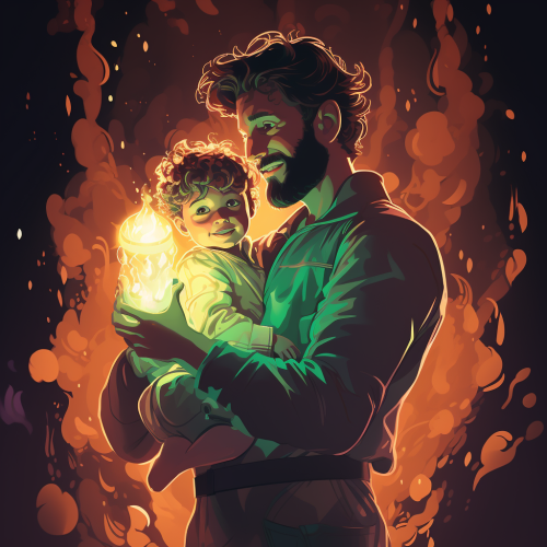 An illustration, of a man holding a child in his arms with a flame torch, he is keeping bacteria at bay with it, done in the style of a survival guide,