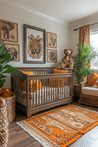 Take a full view photo of a Safari Fun-themed barndominium nursery, featuring animal prints, exotic plants, and earthy colors. The decor should include elements that capture the essence of an African safari, such as wooden statues, woven textiles, and vibrant artwork. The nursery should be organized in a way that is both playful and educational, stimulating a child’s curiosity about the natural world. Each element should be placed to create an engaging and adventurous space. The image should be shot in a high-quality, DSLR-like style that brings the dynamic and exciting theme to life. Neat and organized. Camera: DSLR - Canon EOS 5D Mark IV. Lens: Canon EF 24-70mm f/2.8L II USM. Composition: Wide shot, room-centered, horizontal orientation, balance between furniture and space. Film: Digital, high resolution, color profile sRGB. Camera settings: ISO 400, f/2.8, 1/60 sec. --ar 2:3 --v 6.1 --s 250