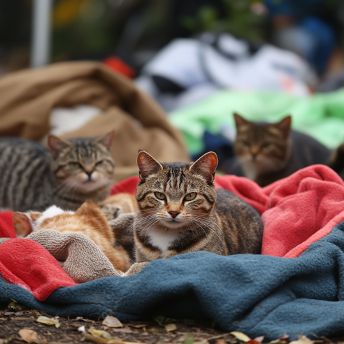 A heartwarming scene of cats helping the homeless and sick animals. The cats are engaged in various acts of kindness: some are distributing food and blankets to other animals in need, while others are gently comforting and caring for sick animals. The setting is a caring and supportive environment, with makeshift shelters and cozy spaces. The atmosphere is filled with compassion and empathy, highlighting the cats’ dedication to providing aid and comfort to those less fortunate.