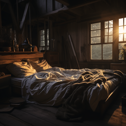 Sony a7iii photograph of large cozy bed with blankets strewn in modern mininalist rustic farmhouse interior, evening light --v 5.2