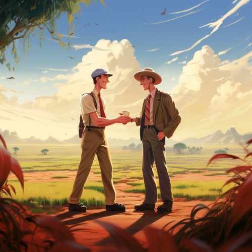 Disney pixar style, two farmers in a beautifull coffee cropfield background, shaking hands, ar-- 1:1 --s 250 --v 5.2