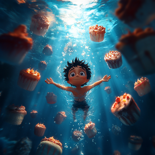 Animated concept art, dramatic angles, dramatic lighting, underwater, camera in water, looking up at surface, drowned boy in center, many cakes floating in water,