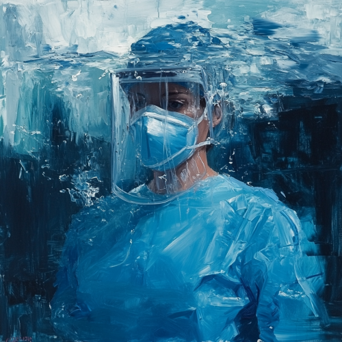in the style of french 19th century painting but slightly abstract : a sterile processing technician, wearing blue scrubs and plastic face shield, covered in water, frantic and drowning