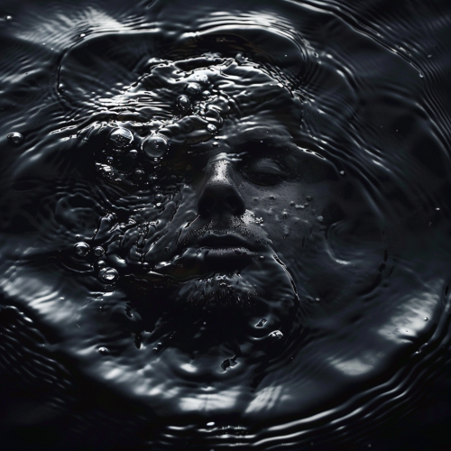black human sillouette is drowning under the water, on the top of water is city with people sillouettes, and in deep water there is cemetery with ghost sillouette
