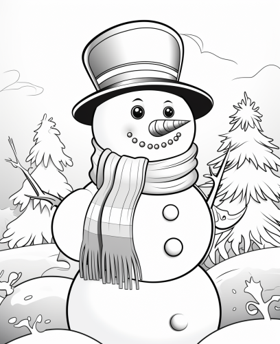 coloring page for adults, simple strong black lines, NO SHADING, black lines only, sketch, no color, no grey, no gray, b&w only, subject ;cheerful snowman with a carrot nose and a top hat, --ar 9:11