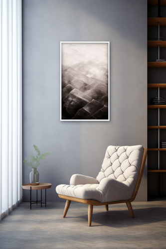 product photography of vertical 24x36inches canvas painting that is in grey living room, 8k, texture, lounge chair --ar 2:3