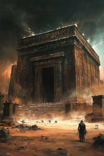 a massive Babylonian temple in the middle of a dusty apocalyptic wasteland, painted in a grim dark fantasy style, painted on canvas with rough guache paint --ar 2:3