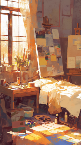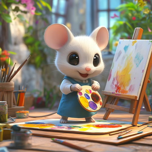 mouse artist painting on an easel, wearing a smock and holding a palette. The mouse is adding vibrant colors to a canvas, with art supplies and a creative studio environment, in a cute and artistic scene. HDR, 4k