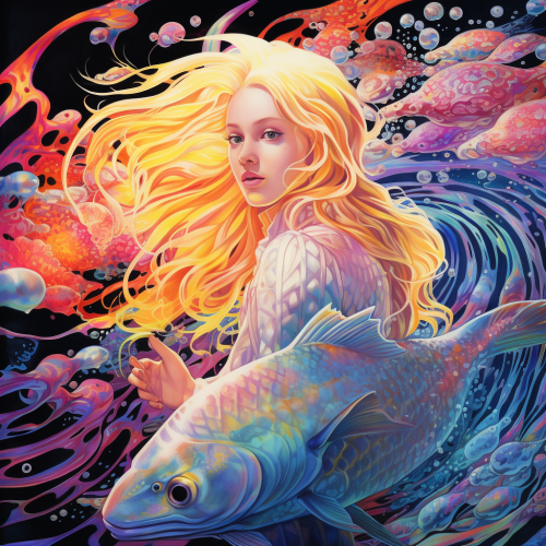 A surreal anime style oil painting of a beautiful woman with long light blonde hair and blue eyes in a mermaid dress riding on the back of a giant Arowana underwater. Trippy, neon rainbow colors, fractal patterns, high detail, iridescent, soft light.