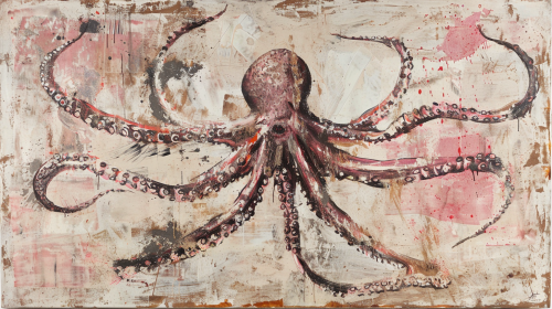 Primitive painting of an aquatic form similar to an octupus that covers most of the canvas surrounded by indistinct smaller muted shapes by Conrad Marca Relli, Cy Twombly, non objective subdued colors in off white,brown, pink. --ar 16:9 --stylize 75