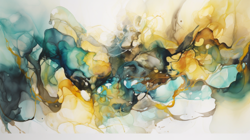 An ethereal watercolor artwork, where abstract waves in vibrant yellow and teal dance across the canvas, the colors intermingling like a lively ocean, evoking feelings of energy and movement, Watercolor painting, bold and expressive strokes, --ar 16:9 --v 5