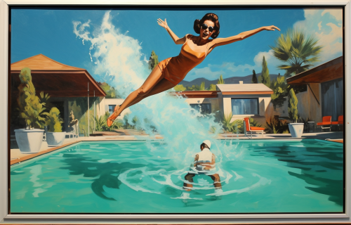 Oil on canvas. 1960's. A glamour woman with flirting attitude diving in a pool. French riviera. Painted in the style of photo-realist contemporary artists. --ar 70:45