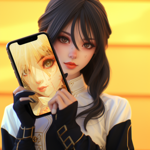 An anime beauty is holding an iPhone 15 pro with a light yellow texture.
