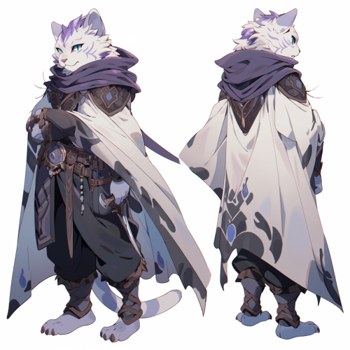 Character design, anthropomorphic cat, white fur, blue and purple cloak, black pants, fantasy, D&D --niji 5