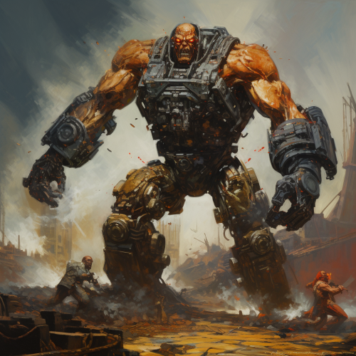 An Oil painting by basil gogos of an part mech + part human + warrior, full body pose, posing for battle, very high quality, angry expression --v 5.2
