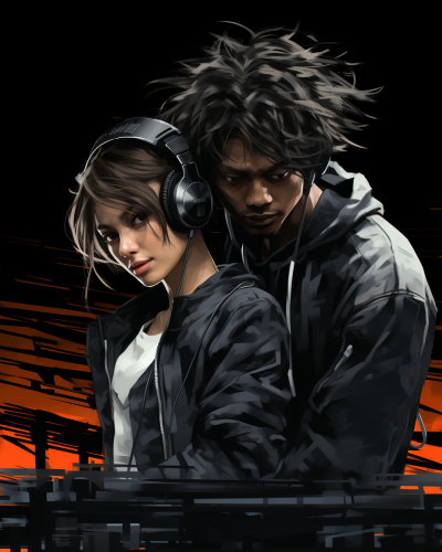 A young black girl, late twenties. her skin has cyberpunk accents, as well as tiny hexagon-like pattern on her skin. She wear very technological-style clothes, has very shiny turquise eyes, and has long straight hair. anime style