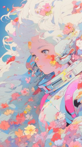 1980s anime, android girl floating in space covered in flowers, retro fashion, muted pastel colors, by Tsukasa Hojo and Toshihiro Kawamoto --ar 9:16 --niji 5