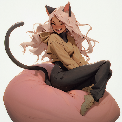 a cat woman sitting on a bean bag,baggy sweatshirt,oversized clothes,pink hair,tan skin,smile,anime style,cute,cat ears,cat tail,--ar 9:16 --niji 5 --style expressive