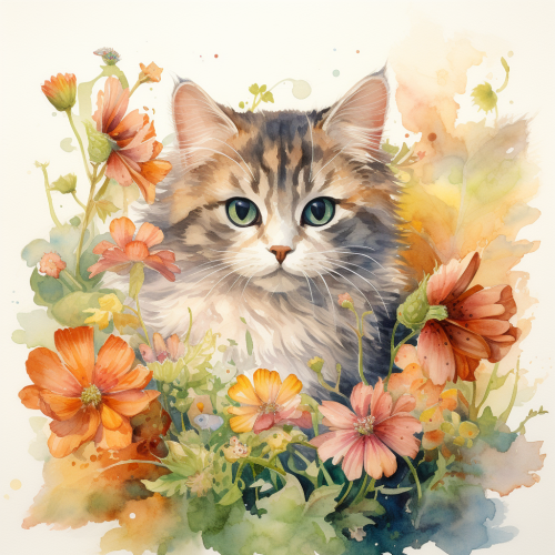 anime style painting with splashes and brushstrokes and textured background light gray fluffy tabby cat with Christmas wreath and garland with glowing lights